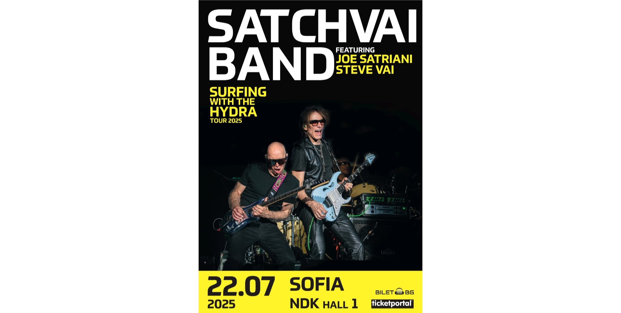 На 22 юли в зала 1 на НДК ще посрещнем за първи път в България новосъздадената група SatchVai Band, включваща Joe Satriani и Steve Vai на китари, Marco Mendoza на бас, Kenny Aronoff на барабани и Pete Thorn също на китара.