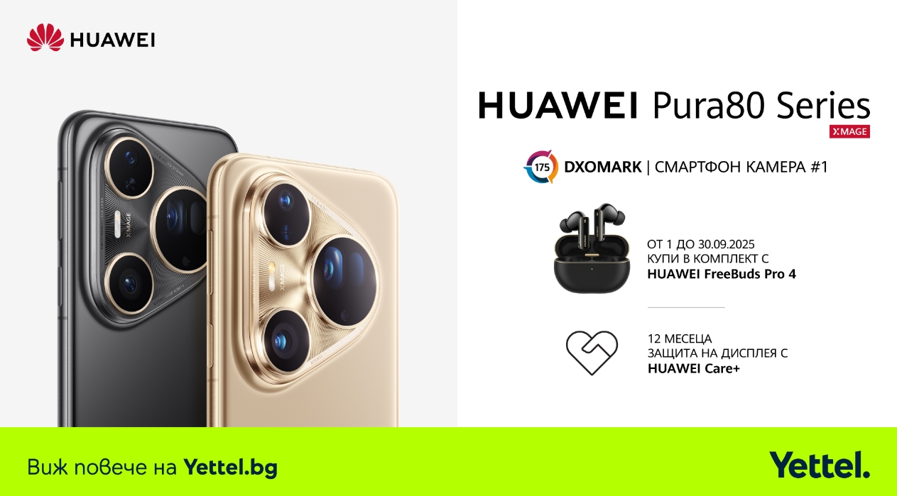 Yettel вече предлага новата флагманска серия HUAWEI Pura 80, която още със световната си премиера привлече вниманието на любителите на мобилните технологии и фотографията. Всички, които изберат да закупят някой от двата апарата в серията до края на септември, ще могат да ги вземат в премиум комплект с безжични слушалки HUAWEI FreeBuds Pro 4 и 12 месеца защита на дисплея чрез услугата HUAWEI Care Premium Service. Така потребителите не само ще получат технологични иновации от последно поколение, но и ще бъдат спокойни, че екранът на техния смартфон е напълно защитен през първата година от използването на устройството.