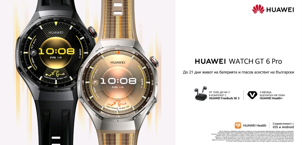 Считано от 19.09. до 04.11.2025 г. часовниците от серията HUAWEI WATCH GT 6 ще се предлагат в комплект с HUAWEI FreeBuds SE 3 и услугата HUAWEI Health+, достъпна безплатно за първите 3 месеца. Пълните условия за услугата са достъпни в приложението HUAWEI Health. Цветът на слушалките в комплекта може да варира според наличностите. Офертите са валидни до изчерпване на количествата на препоръчителни цени както следва: WATCH GT 6 Pro Titanium: 999 лв. (€510,7), Black Silicon: 749 лв. (€382,9), Brown Woven: 799 лв. (€408,5), WATCH GT 6 Black Rubber: 499 лв. (€255,1), Green Woven: 549 лв. (€280,7), Grey Leather: 549 лв. (€280,7), White Leather: 499 лв. (€255,1), Milanese: 599 лв. (€306,2), Brown Woven: 549 лв. (€280,7), Black Silicon: 499 лв. (€255,1), Purple Silicon: 499 лв. (€255,1). Офертата важи до 04.11.2025 или до изчерпване на количествата в официалната партньорска мрежа на Huawei за България, която включва A1, Vivacom, Yettel, Технополис, Техномаркет, верига магазини Зора и избрани партньори на дистрибутора Поликомп.
