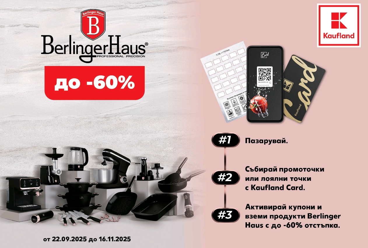 Брандът Berlinger Haus предлага електрически уреди, съдове за печене, както и домакински уреди, сред които тенджери и тигани от кован алуминий без PFOA, олово и кадмий, подходящи за всички видове котлони. Те могат да се купят на ексклузивни цени през промоционалния период с активиране на купони с Kaufland Card или чрез събиране на промоточки от пазаруване в специален паспорт, който може да се вземе от касите или на информация. За всеки 5 лева от стойността на покупка в хипермаркета, всеки клиент може да получи по 1 точка.