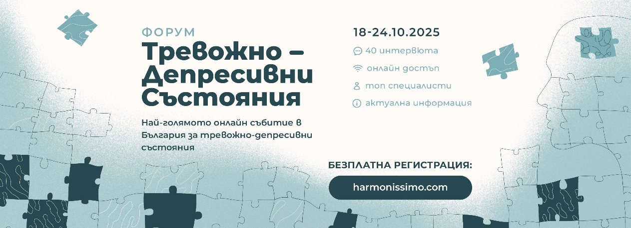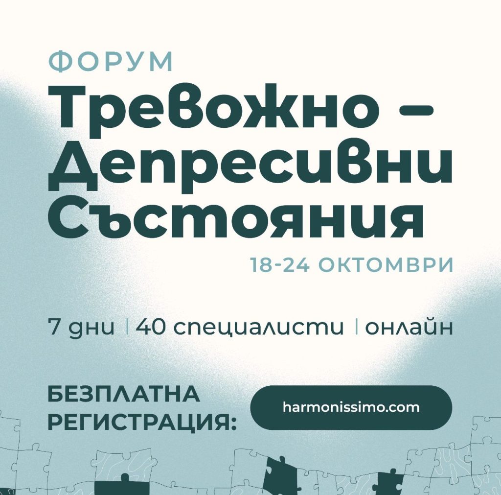 От 18 до 24 октомври ще се проведе форум „Тревожно-Депресивни Състояния“ – най-мащабното безплатно онлайн събитие в България, посветено на темите за тревожността, депресивността и грижата за психичното здраве. В рамките на седем дни форумът ще обедини над 40 водещи специалисти, сред които психиатри, психотерапевти, невролози, психолози, научни изследователи и експерти от различни области. Те ще споделят актуални научни открития, иновативни методи и практически подходи за овладяване на тревожните и депресивни състояния.