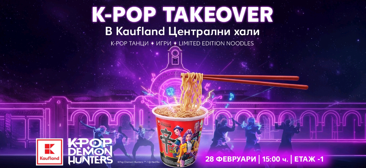 Много музика, танци и изненади очакват феновете на K-Pop на Сцена „Централни хали“ на 28 февруари от 15:00 ч. Специалното събитие е с вход свободен и ще събере на едно място почитателите на корейската поп култура. Акцент в програмата ще бъдат филмът K-Pop Demon Hunters и тематични нудли, вдъхновени от неговите герои.