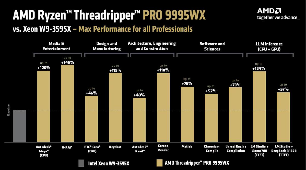 Те са специално създадени за професионалисти и бизнеси, които изискват производителност, надеждност и разширяемост от най-високо ниво и осигуряват несравнима многоядрена производителност. При сравнения с фиксирана честота с предшественика си, Threadripper PRO 7000, се наблюдава повишение на IPC от 16% в основните бенчмаркове за работни станции – и до 25% в бенчмарка SPECworkstation 4.0 за AI и ML1. При сравняване на новия флагмански 96-ядрен процесор Threadripper PRO 9995WX с предишното поколение PRO 7995WX, е налице дори до 26% по-висока производителност. Това се основава на широк набор от смесени натоварвания в реалния свят във всяка основна вертикална област.