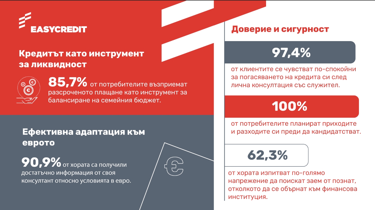 Въпреки че приемането на еврото е стимулирало близо 78% от анкетираните да бъдат по-внимателни към харченето си, обслужването на кредитите в новата валута остава ясно и лесно за почти 90% от клиентите на компанията. Проучването подчертава, че за съвременния българин професионалният кредит е по-щадящ вариант от психологическа гледна точка, като над 62% от анкетираните изпитват по-голямо напрежение да поискат заем от близки или роднини, отколкото да се обърнат към доказана финансова институция. Така „Изи Кредит“ продължава да изгражда среда на доверие, съчетавайки гъвкави финансови решения с висока информираност и лична грижа за всеки клиент.